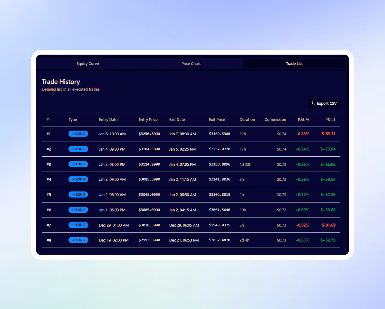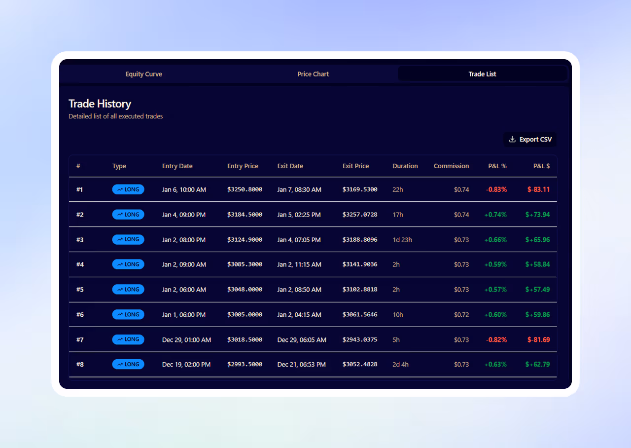 Every trade executed during testing is logged with clear entry and exit criteria, allowing for full transparency into how decisions are made.